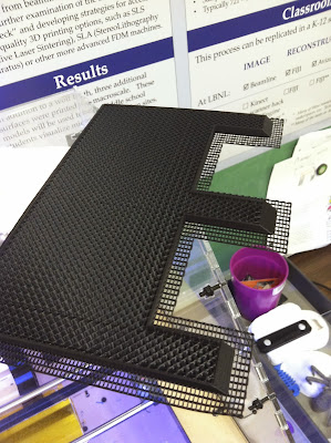 ATTEMPT #2: Redesigned on TinkerCAD. Printed on the Makerbot (Oct 6) after a lengthy gcode generation. At 25% fill, this will be an estimated 17 hour 22 minute print job. I started it early (like 5 am early) in the morning. It seemed to be working quite well. Cole has really pushed our Makerbot to its limits... literally. Since the build took up the entire build plate, part of the raft even hung off the edge of the heated bed.